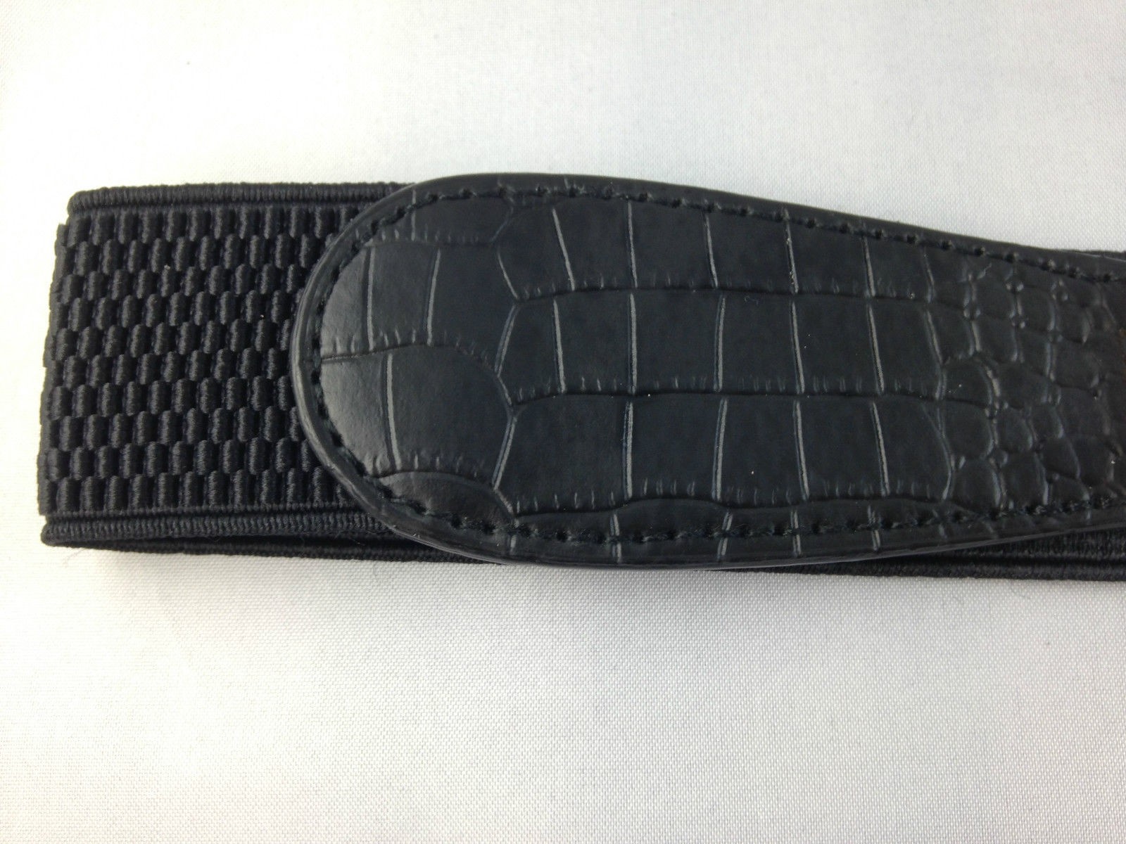 Stretch elastic waistband measures 36.5cm x 3.5cm PU leather snake skin decorative panel on front of belt measures 8.5cm x 4cm (at widest point) and is situated on either side of the square gold links Gold links and gold panel measures 10cm x 2.5cm Gold links are secured to back of belt with 4 flat gold screws. These screws are not visible when belt is being worn. Suitable for sizes 8 - 12 Available in black or white with gold links. - Reviews